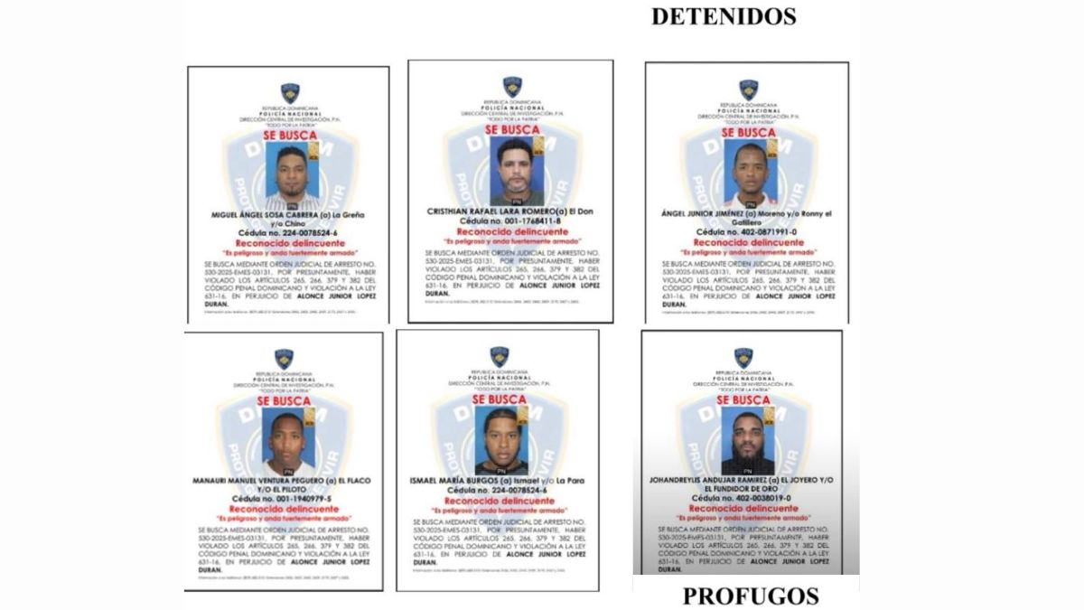 Santo Domingo Este. – La Policía Nacional informó el desmantelamiento de una banda criminal dedicada a asalto a mano armada, extorsión y otros delitos en el sector Los Frailes, Santo Domingo Este. Entre los detenidos se encuentran Cristhian Rafael Lara Romero, alias “El Don”; Miguel Ángel Sosa Cabrera, alias “La Greña” o “Chino”; Ismael María Burgos, alias “La Para”; Ángel Junior Jiménez, alias “Moreno”; y Manauri Manuel Ventura Peguero, alias “El Flaco”, señalado como el cabecilla del grupo.